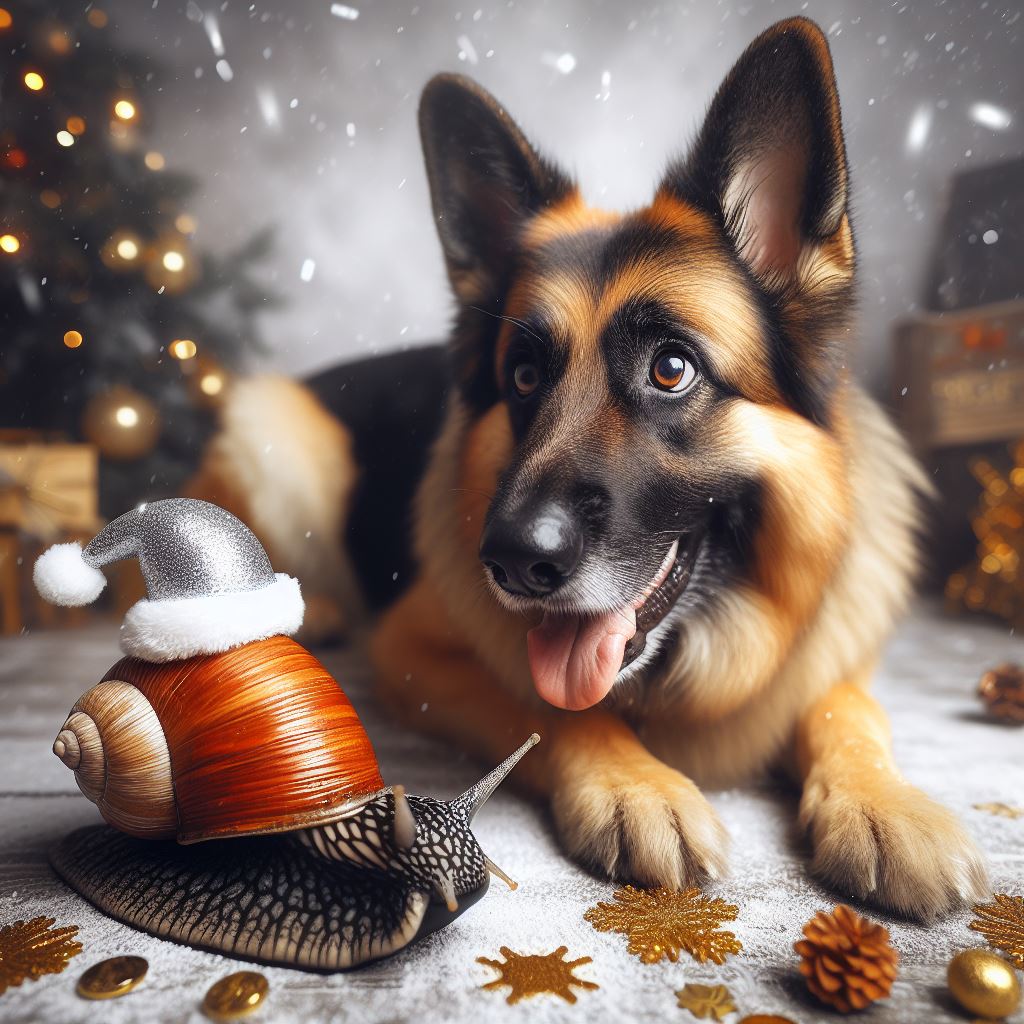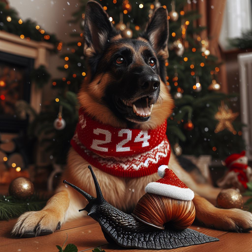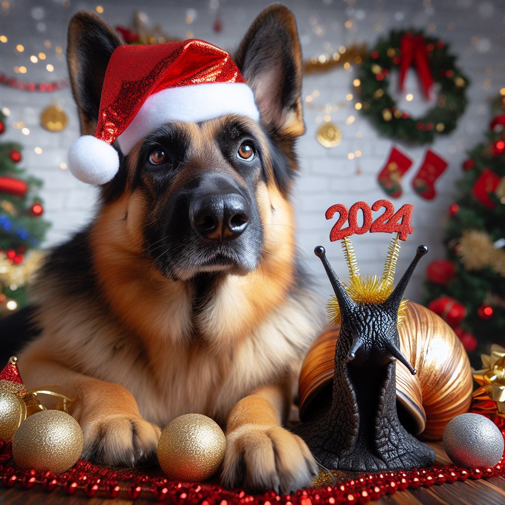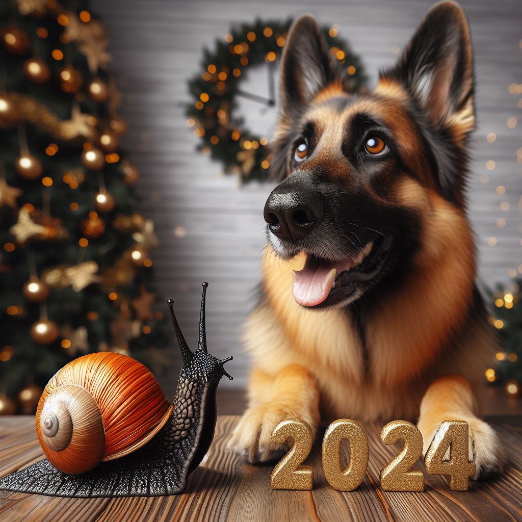 I finally got the result when I said, “A German shepherd and a snail celebrating New Year’s outside with fireworks, the new year is 2024.” But even then…